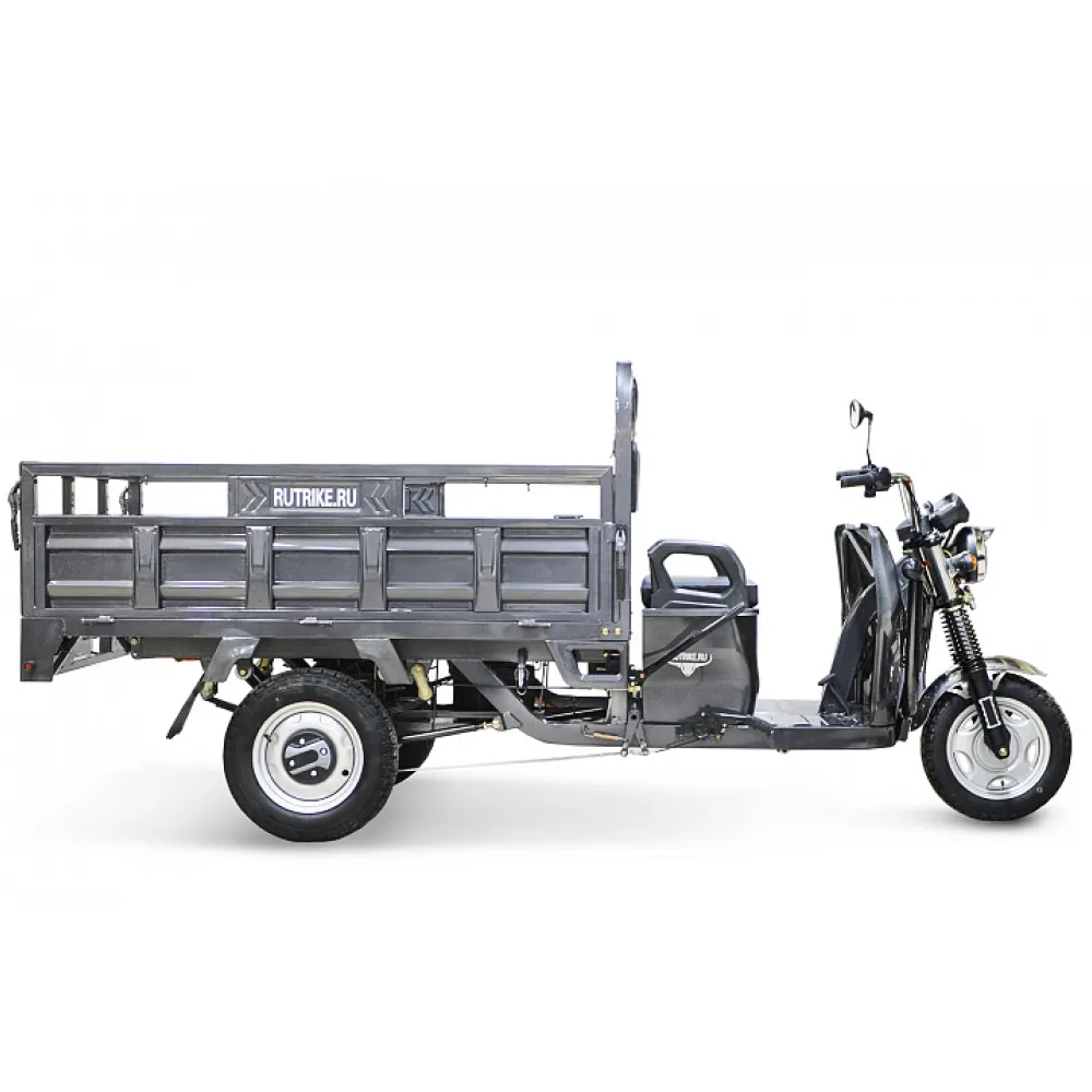 Грузовой электротрицикл Rutrike D4 NEXT II 60V1500W синий – мощная техника в презентабельном дизайне моментально привлекает внимание представителей бизнеса и фермеров. Объемный багажник, вместительное виденье, лучшие параметры удобства и комфорта заставляют внимательнее присмотреться к техническим характеристикам. Наш интернет-магазин предлагает купить электротрицикл по разумной стоимости. Каждому покупателю гарантирована бесплатная консультация, помощь в оформлении заказа. Модель оснащена мощным движком на 1500 Вт, который в сочетании с емкой батареей (от 55А*ч) обещает максимальный разгон до 25 км/час, которого хватает на преодоление дистанции до 80 км. Производитель обращает внимание, батарея не входит в комплектацию. Купить АКБ, подобрать максимально совместимую можно благодаря нашему интернет-магазину. Из других преимуществ производитель выделяет максимальную оснащенность функционалом. Техника оборудована зеркалами заднего вида, гидравлической амортизационной подвеской, информационным дисплеем. Имеется дополнительное место для пассажира. Широкая платформа для ног в сочетании с сиденьем исключает дискомфорт и проблемы с позвоночником. Широкие колеса (переднее х заднее - 3,50-R12 х 4,00-R12) отлично сцепляются с грунтом. Вместительный кузов размерами 3270 x 1200 x 1450 ДхШхВ – настоящая находка для предприимчивых личностей