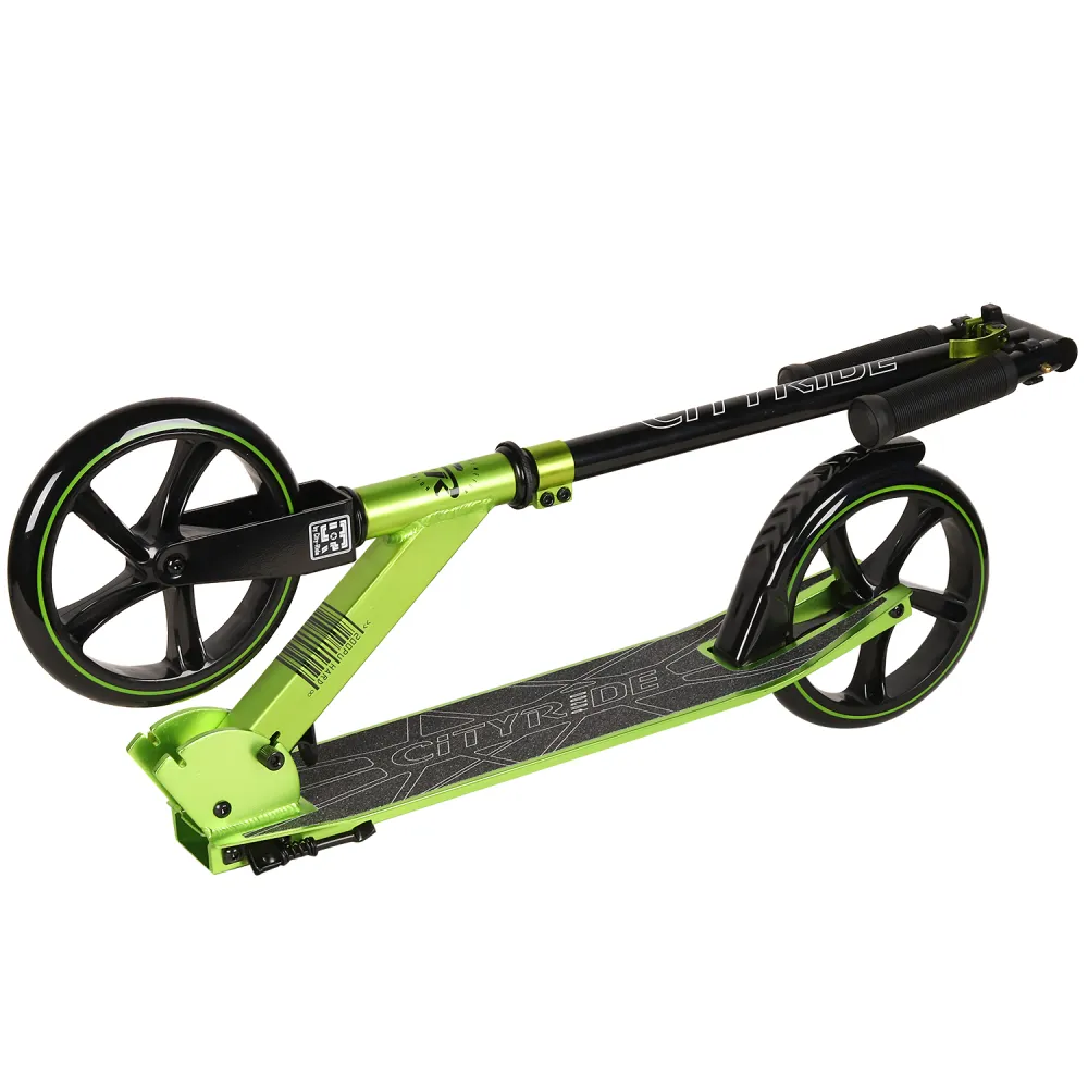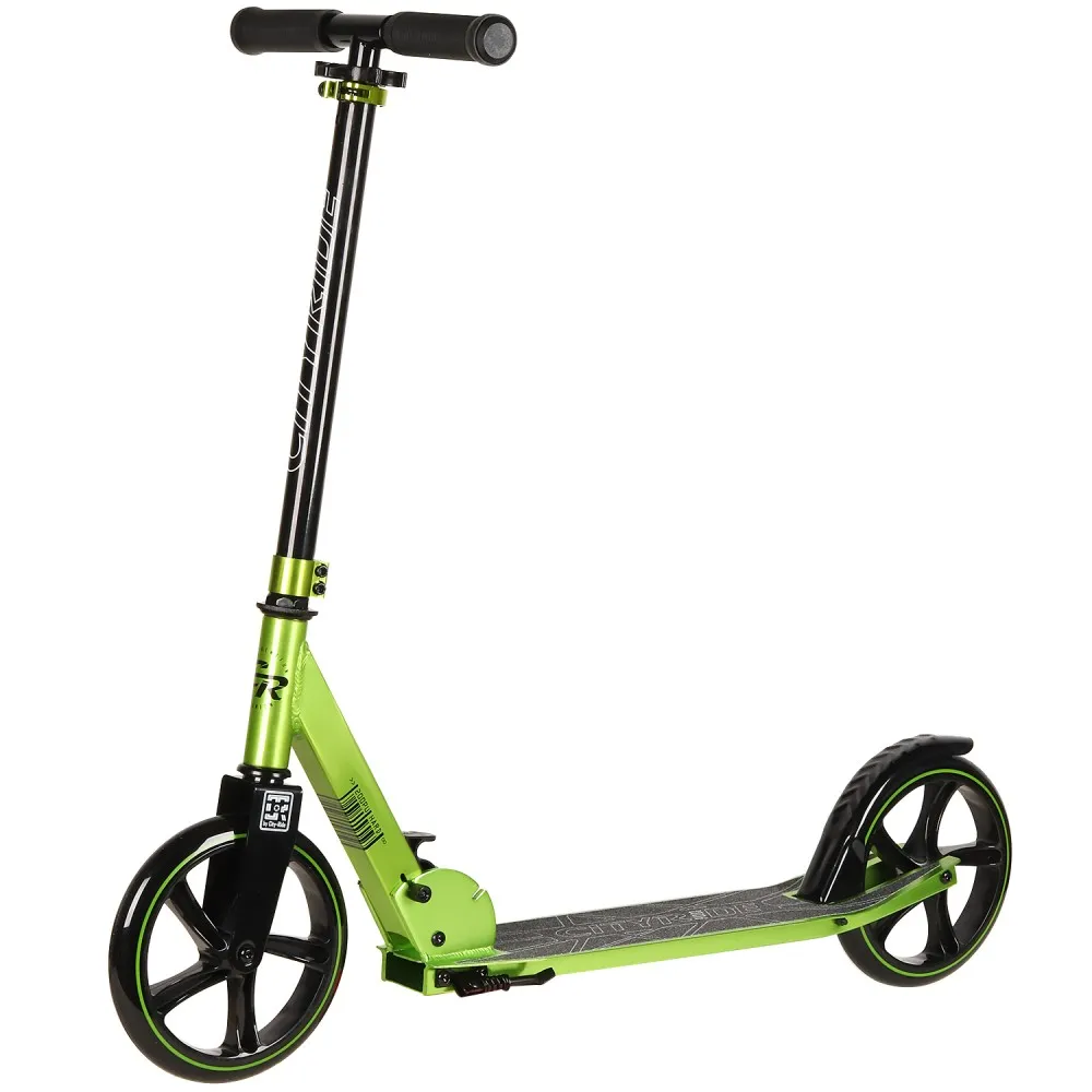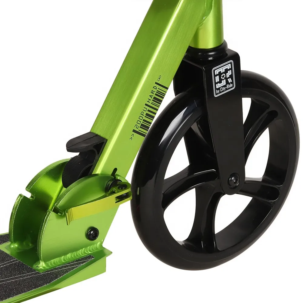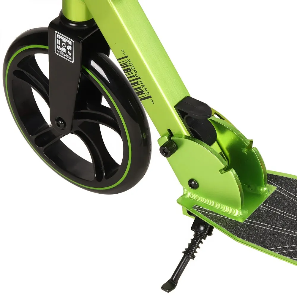 Двухколесный самокат CITY-RIDE 200, зеленого цвета – несомненный лидер продаж со складной конструкцией и экстраординарным дизайном. Тс смотрится модно и презентабельно. Легко входить в повороты позволяет стальной руль (930 мм), который регулируется по росту райдера. Тс обрадуются пользователи (старше 8 лет, не больше 100 кг). Большие колеса PU 200 мм вращаются легко. Наш интернет-магазин предлагает быструю доставку на выгодных условиях и реальные цены.
