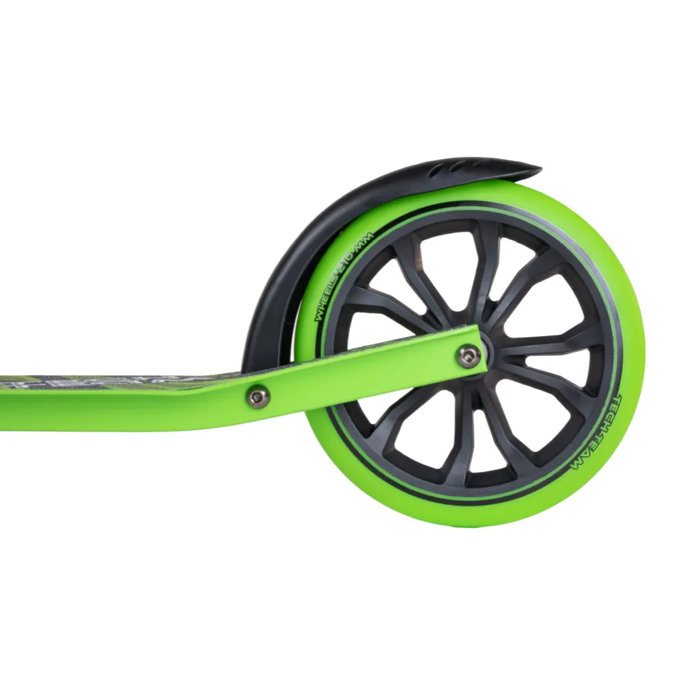 Модель оснащена широким (47 см) регулируемым рулем (760-910-965-1115 мм). Имеет спецзажим, исключающий люфт и посторонние шумы. Прочная и надежная при эксплуатации в жестких условиях. Колесная часть – 210 мм, полиуретановая, мало стираемая. Клиренс составляет 55 мм, гарантирует отсутствие дискомфорта при преодолении проблемных участков. Дека – широкая, достаточная для размещения двух стоп. Нескользящая шкурка увеличивает параметры безопасности. Техника предназначена для активного время провождения на свежем воздухе с друзьями и родителями. Безопасная и простая в эксплуатации. При необходимости может трансформироваться в компактные эргономичные размеры. Простота транспортировки обеспечена наличием специального ремешка. Надеемся, вам понравился самокат. Предлагаем приступить к оформлению заказа.